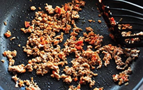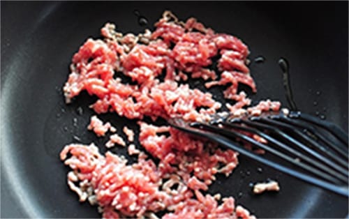 フライパンにごま油をひき、豚ひき肉を中火で炒めます。