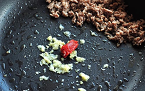 豚ひき肉がパラパラになったらフライパンの端に寄せ、空いたところにしょうがとにんにく、豆板醬を入れて炒めます。