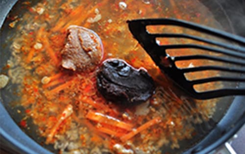 1分ほど煮たら一旦火を止め、味噌を加えて溶かします。