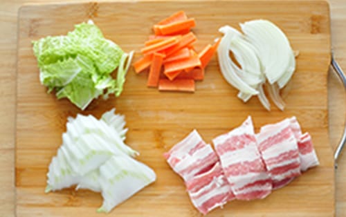 白菜は白い軸と緑の葉の部分に分けて軸はそぎ切りに、葉はざく切りにします。にんじんは皮を剥いて短冊切りに、玉ねぎは薄切りにします。豚バラ肉は3~4cm幅に切ります。