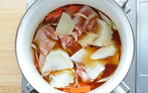 鍋に水とめんつゆを入れ、白菜の軸とにんじん、玉ねぎ、肉を加えて中火にかけます。