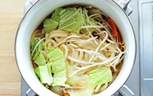 野菜がやわらかく煮えて肉に火が通ったらうどんと白菜の葉、もやしを入れて1~2分煮ます。