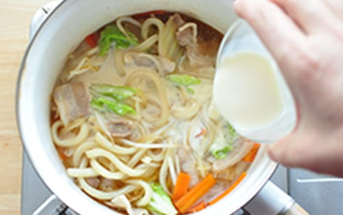 うどんがほぐれて温まり、白菜の葉ともやしがしんなりとしたら豆乳を加えます。沸騰直前まで温めれば完成です。