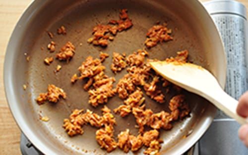 長ねぎ・しょうが・にんにくはみじん切りにして、ごま油をひいたフライパンで炒めます。良い香りがたったら油を切ったツナ・豆板醬・しょうゆ・砂糖を加えて炒め合わせます。