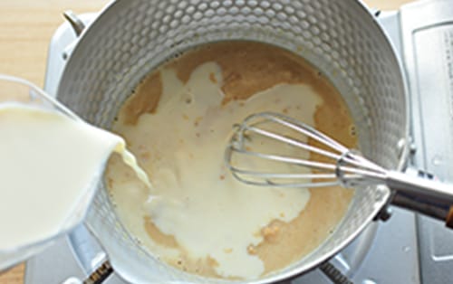 鍋に練りごまと味噌を入れ、豆乳を少しずつ加えながらホイッパーで混ぜてのばします。水と鶏がらスープの素を加えて火にかけ、沸騰直前まで温めます。