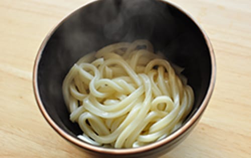 冷凍うどんはパッケージの表示に従い、電子レンジで温めるか熱湯でゆでて丼に盛り付けます。