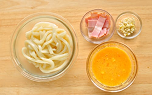 冷凍うどんはパッケージの表示に従い、電子レンジで温めるか熱湯でゆでます。全卵は溶きほぐして粉チーズとよく混ぜ合わせます。ベーコンは1cm幅に切り、にんにくはみじん切りにします。