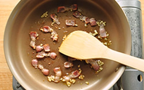 フライパンにオリーブオイルをひき、弱めの中火でにんにくを炒めます。良い香りがたったらベーコンを加えてカリッとするまで炒めます。