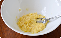 ボウルの中にバナナを入れて、フォークでつぶします。