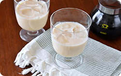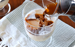 きれいな2層に仕上げるコツは、グラスにアーモンドミルク、氷、コーヒーの順に入れること。コーヒーをアーモンドミルクに直接当たらないよう氷の上にそっと注ぐことも、大切なポイントです。