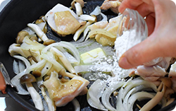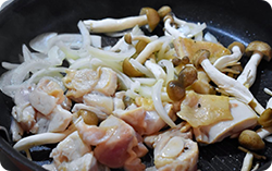 フライパンに油(分量外)を熱し、軽く塩こしょうを振った鶏肉と玉ねぎ、しめじを炒めます。