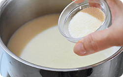 鍋の中にゼラチンを振り入れます。完全に溶けるまでよく混ぜ合わせましょう。