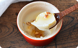 プリンの上に砕いたアーモンドをのせ、好みの量のはちみつをかけます。