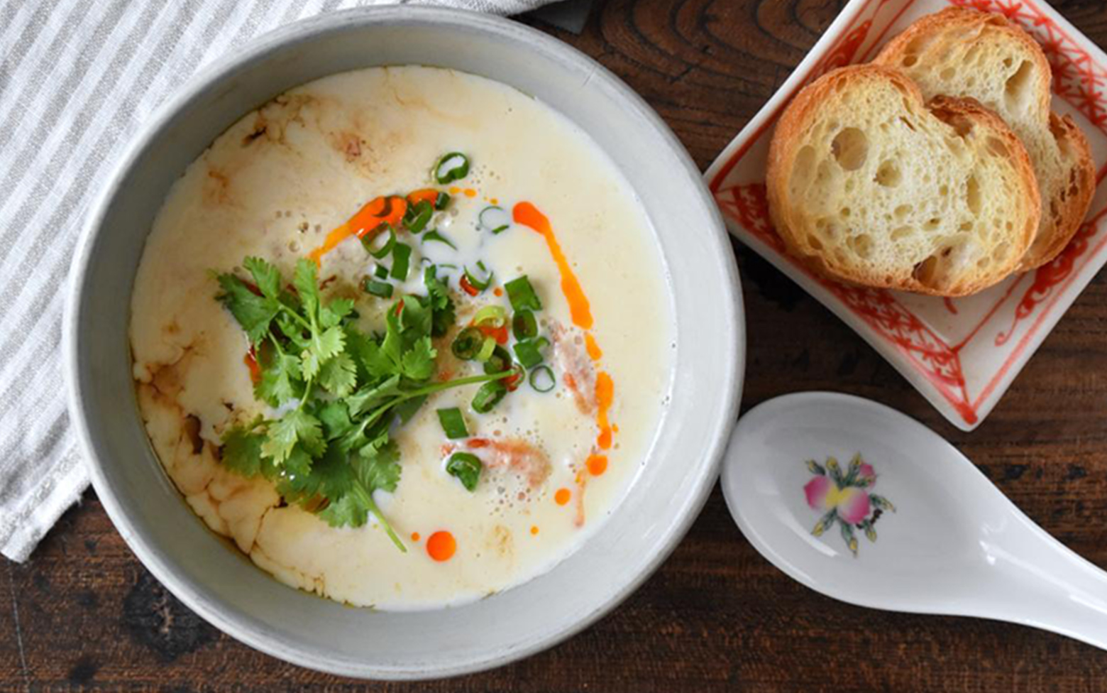 酢を黒酢に、しょうゆをナンプラーに代えると、さらに本格的な味わいに。桜えびとザーサイが入っていることで、深い旨みも楽しめます。本場では油条(ユーティアオ)という揚げパンを添えますが、フランスパンで代用できます。お好みでパクチーをトッピングしてもOKです。
