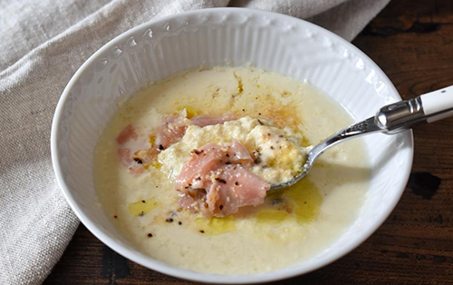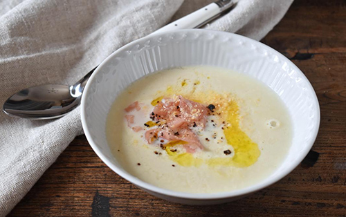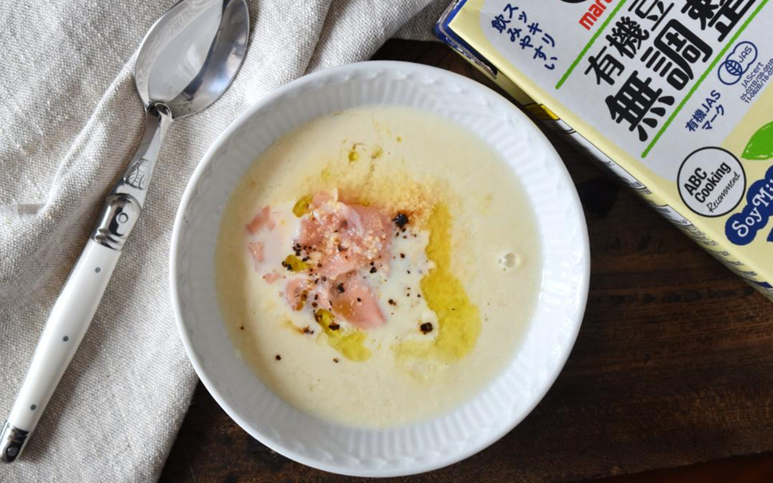 洋風の調味料や具材を使って作る、新しい味わいのシェンドウジャンレシピです。オリーブオイルやチーズが豆乳とよく合い、生ハムの塩味が食欲をそそります。