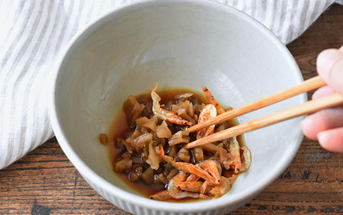 器に酢、しょうゆ、ザーサイ、桜エビを入れて、軽く混ぜ合わせます。
