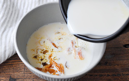 調味料が入った器に温めた豆乳を注ぎます。そのあと動かさずに2分ほど置いておきます。