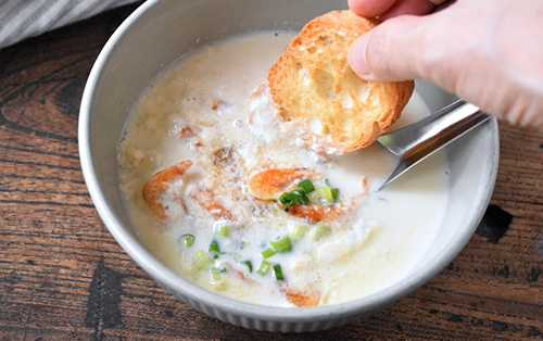 小ねぎをトッピングし、ラー油を数滴たらします。フランスパンを添えてできあがりです。