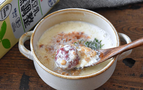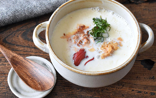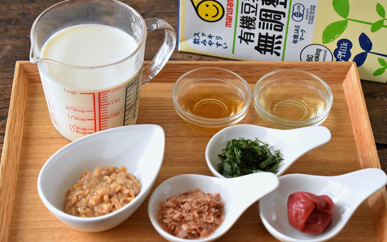 トッピングに使う納豆は、同じ大豆製品である豆乳と相性がいい食材。梅干しは、酢そのものの酸っぱさを不思議とやわらげる効果があります。トッピングはこのほか卵黄やキムチを添えるなど、自由にアレンジが可能。するする食べられるので、食欲がないときにもおすすめですよ。