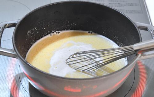 鍋に水と調味料を入れて加熱します。調味料が溶けるまでよく混ぜながら、煮立たせます。このときはまだ豆乳は加えません。