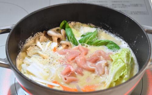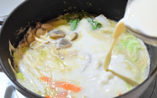 豆乳は沸騰させると分離してしまうので、具材を煮てから最後に加えます。そのあと弱火で温める程度にして、ぐらぐらと煮込まないことが大切です。