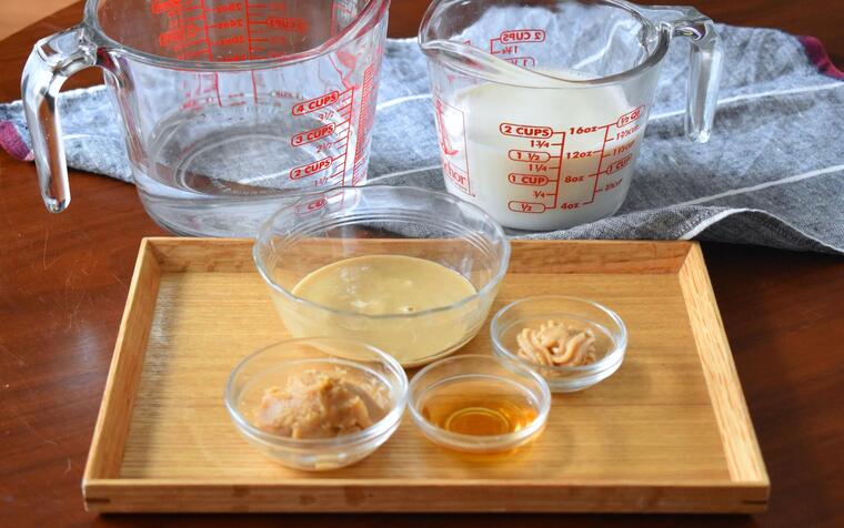 みそは合わせみそのほか、白みそもおすすめ。みその種類によって塩気が異なるので、豆乳の量で味の濃さを調整しましょう。