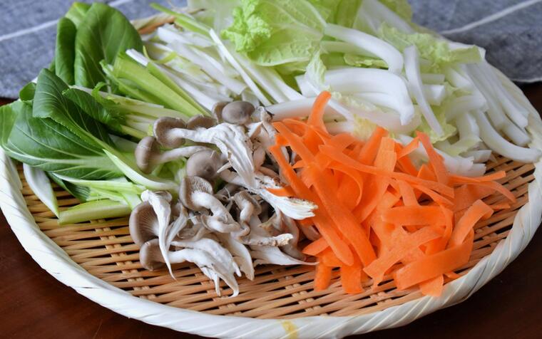 野菜をカットします。なるべくさっと火が通るように、薄切りや千切りなどにします。しめじは、1本ずつほぐしておきましょう。