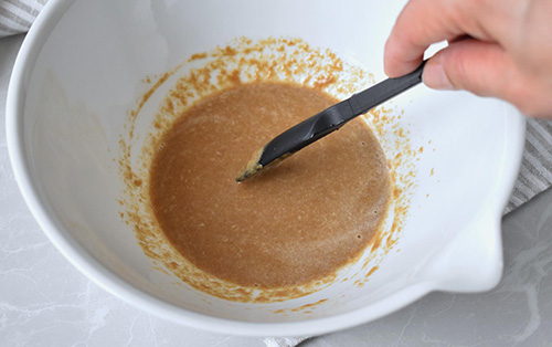 ボウルに中華スープの素と練りごまを入れ、お湯を加えてよく混ぜ溶かします。