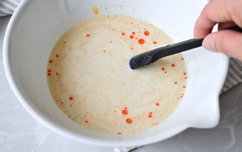 無調整豆乳とラー油を加え、混ぜ合わせてから冷蔵庫で冷やします。