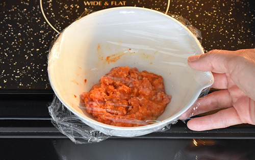 ふんわりとラップをかけて、電子レンジで1分(600W)加熱します。いったん取り出してよく混ぜ合わせ、再び電子レンジで1分(600W)加熱します。火が通っていないようであれば、様子を見ながらさらに少しずつ加熱します。