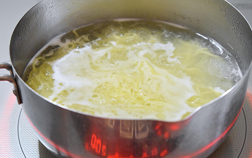 中華麺を、袋の表示に従ってゆでます。冷水で洗い、水気をよく切ります。