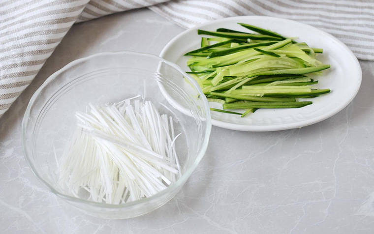 ・長ネギ(白い部分)は千切りにして水にさらしておきます。きゅうりも千切りにします。