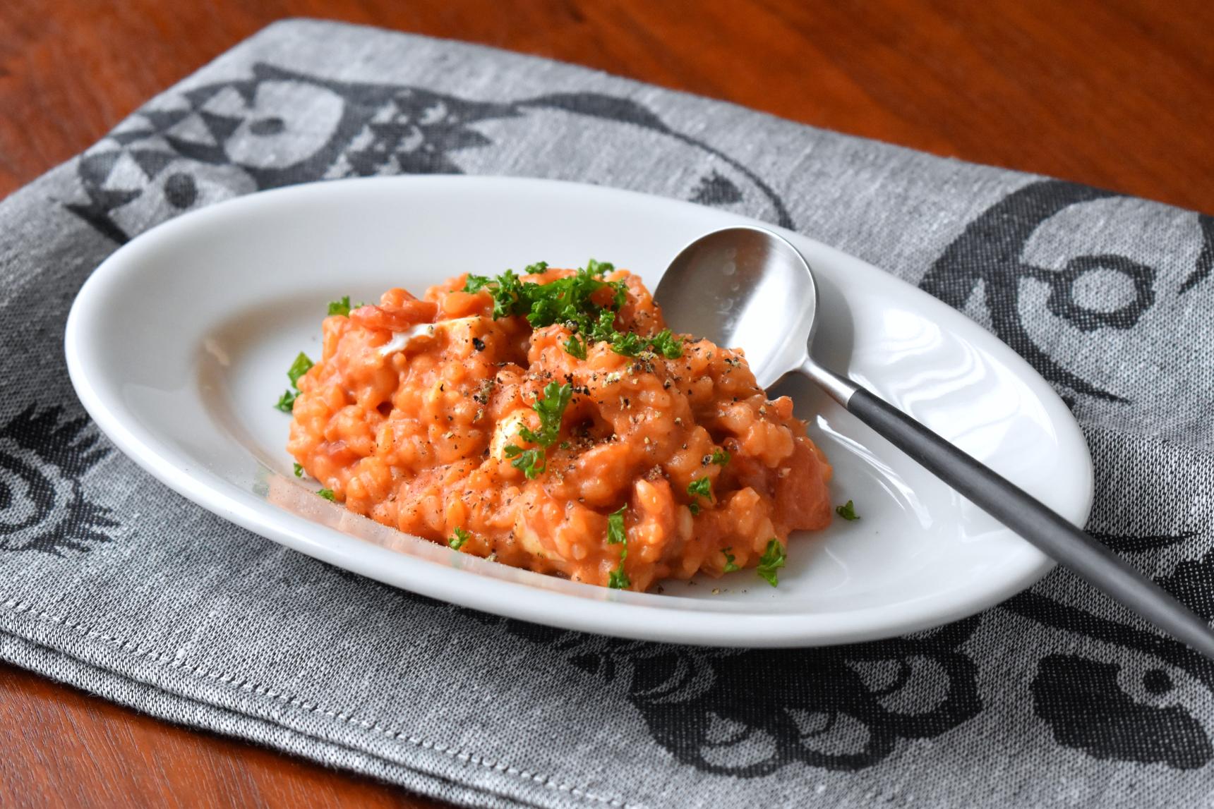 マルサンアイの「無調整豆乳」を使って作る、トマトチーズリゾットのレシピです。生米から作る本格派で、アルデンテな食感に仕上げます。豆乳を使うことによりトマトの酸味がまろやかになり、クリームチーズのコクも加わってこっくりやさしい味わいに。