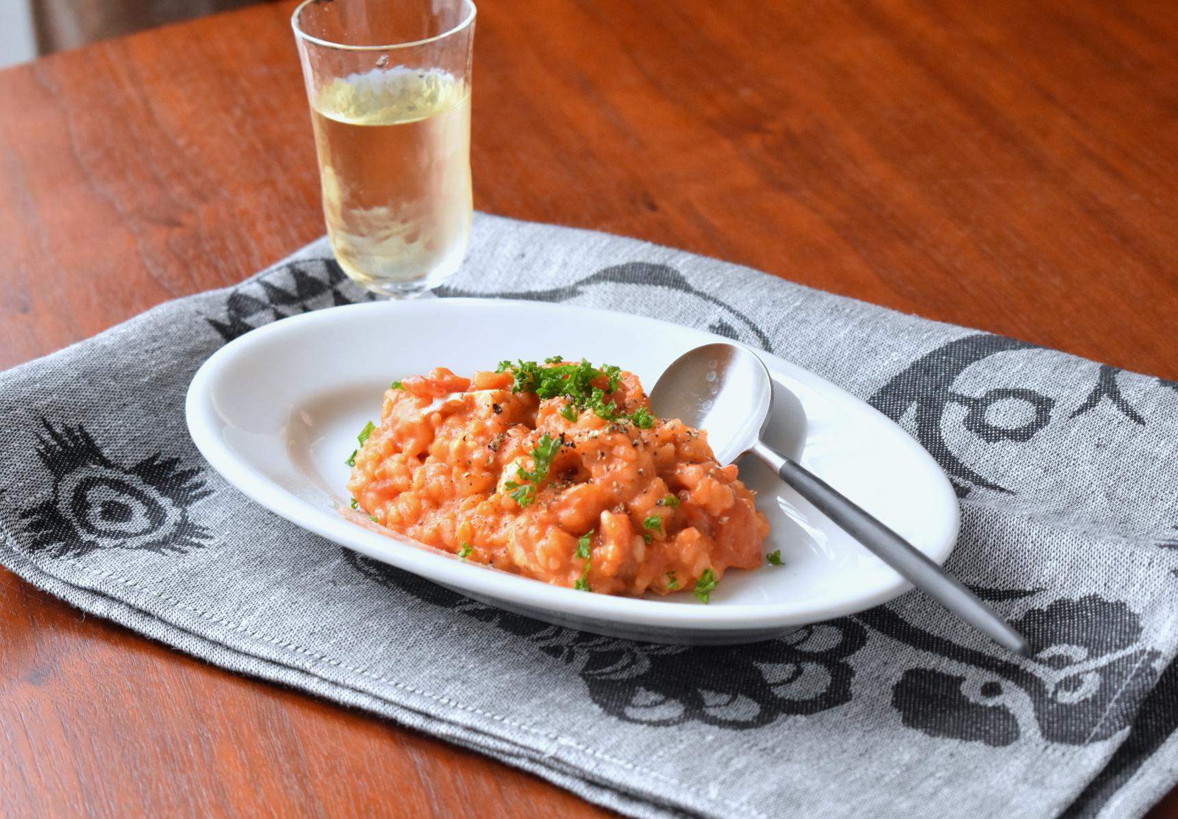 豆乳で作るトマトチーズリゾットは、日本酒やワインなどすっきりとした味わいのお酒との相性も抜群。食事としていただくのはもちろんのこと、おうち飲みのおともにするのもおすすめです。