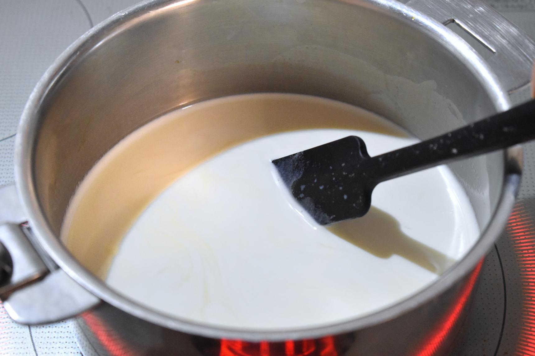 鍋に豆乳とチキンコンソメを入れて加熱します。コンソメが溶けたら火を止めます。温める程度でよく、ぐらぐらと沸かしすぎないようにしましょう。