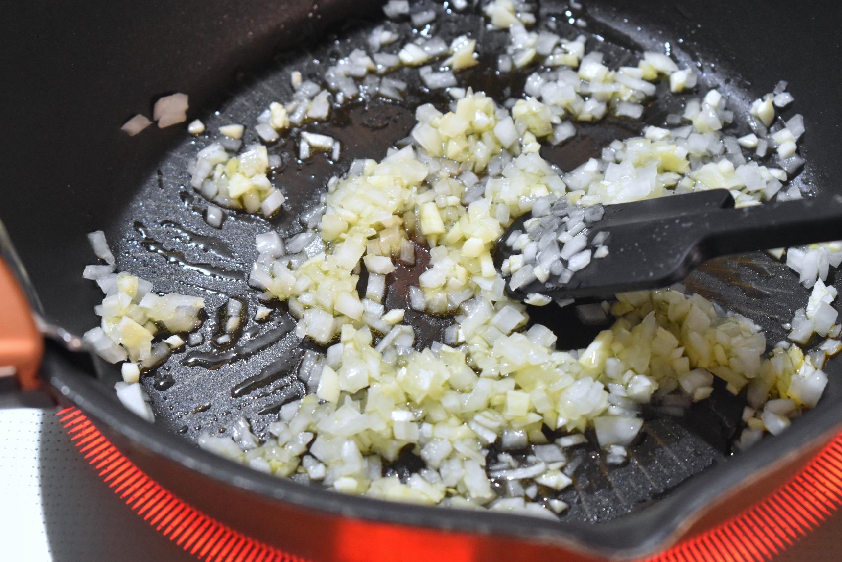 深めのフライパンにオリーブオイルをひき、玉ねぎとにんにくを中火で香りが立つまで炒めます。