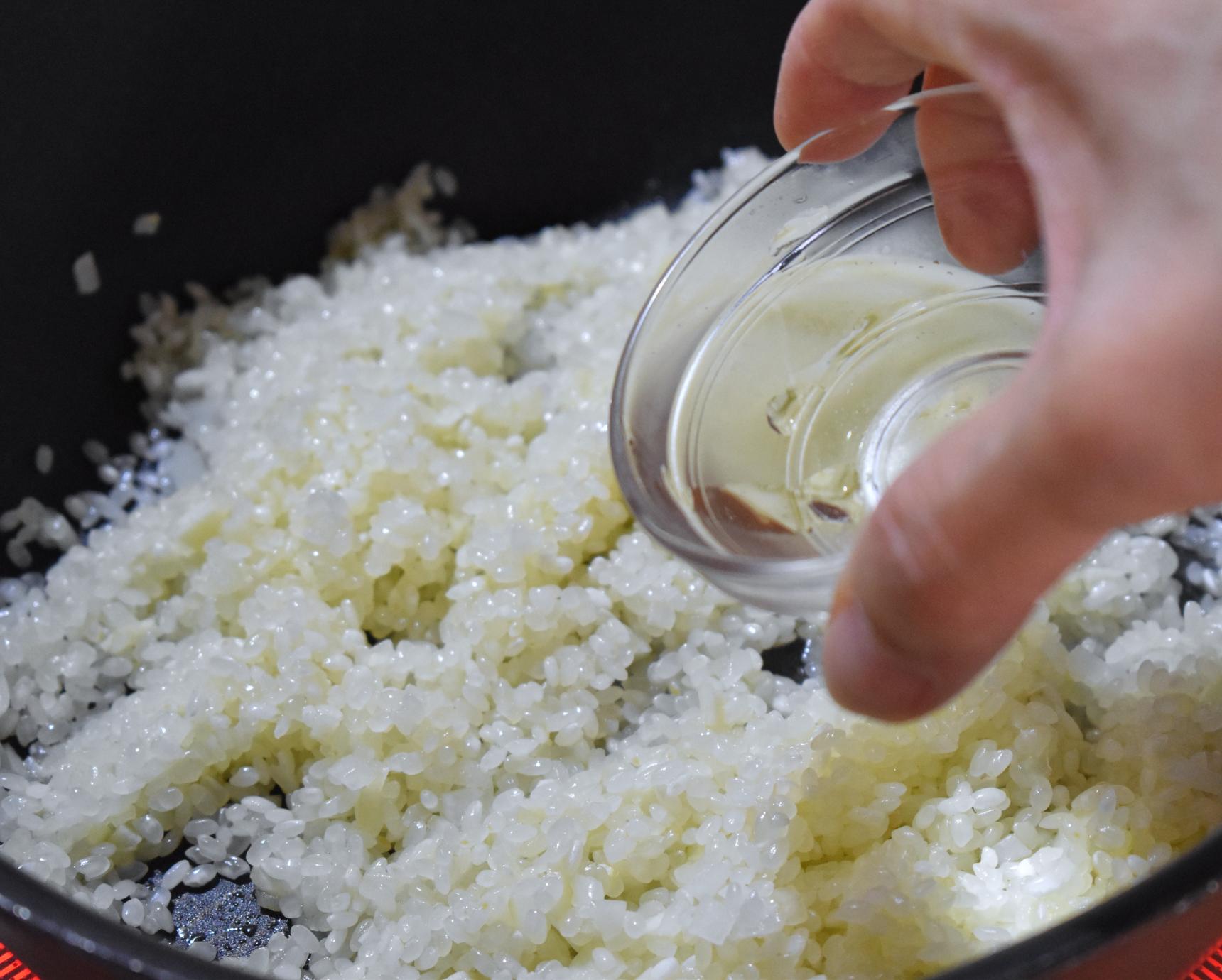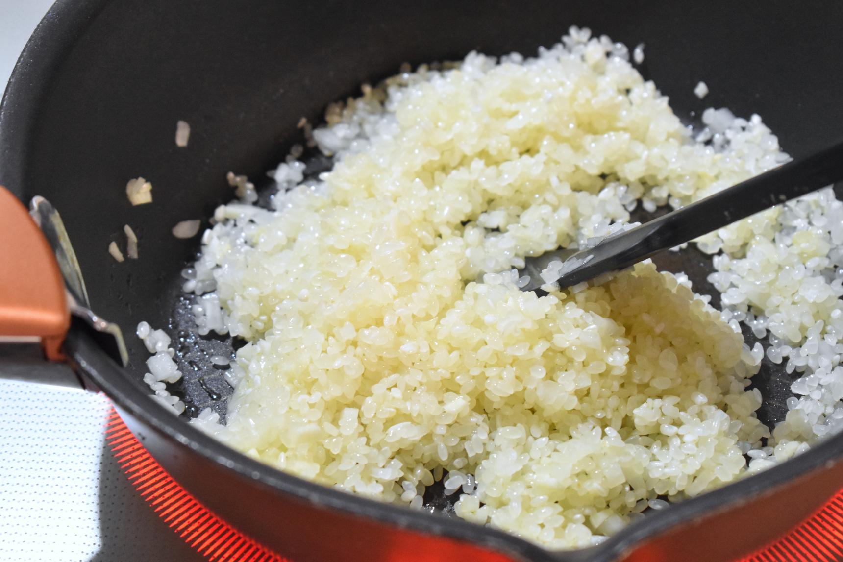 生米を洗わずに加え、米が透き通ってくるまで中火で炒めます。