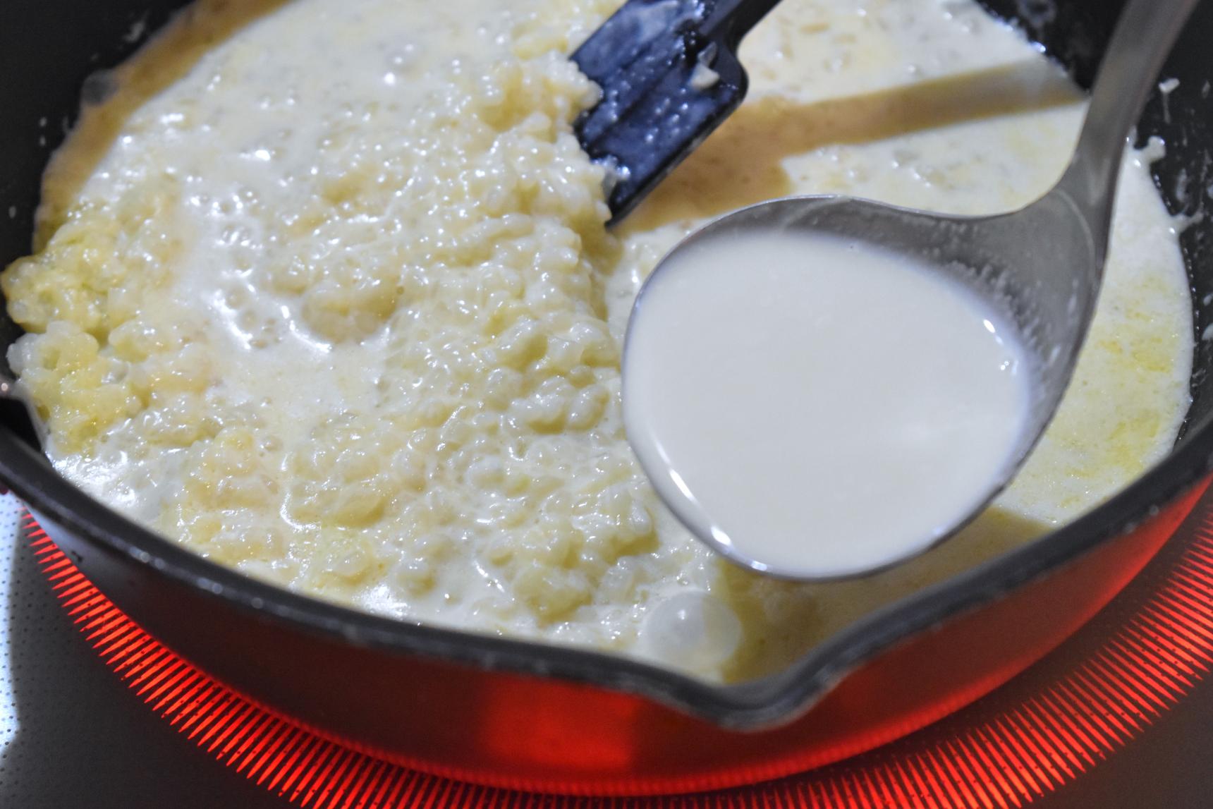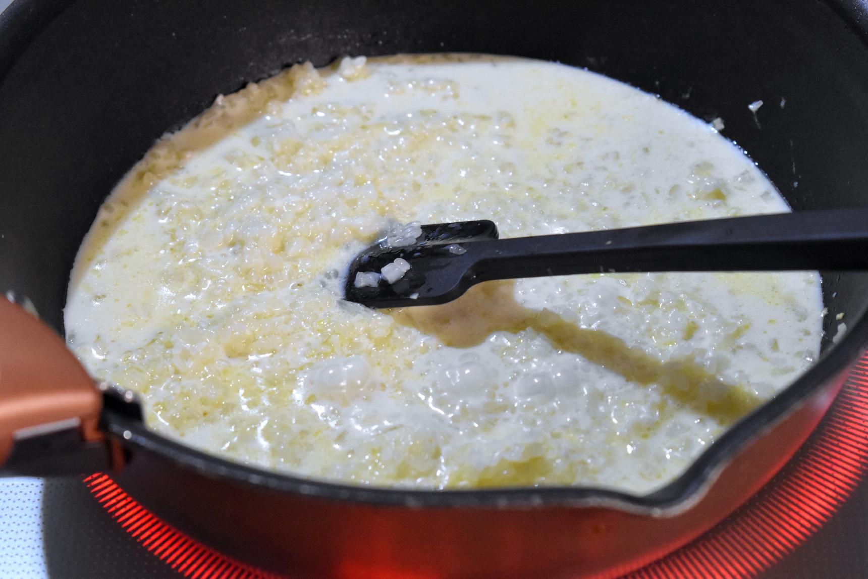 全体の水分が少なくなってきたら、コンソメを溶かした豆乳の残り半量を加えます。再度弱めの中火で加熱します。