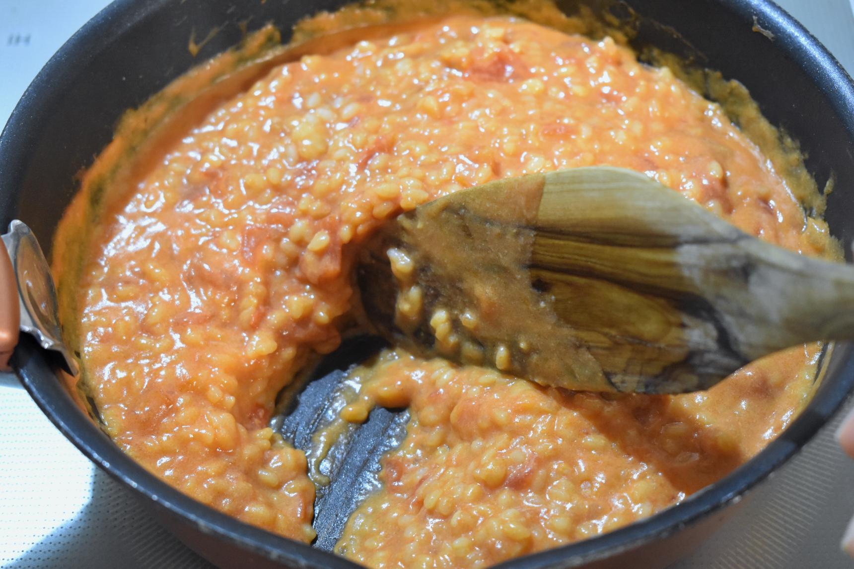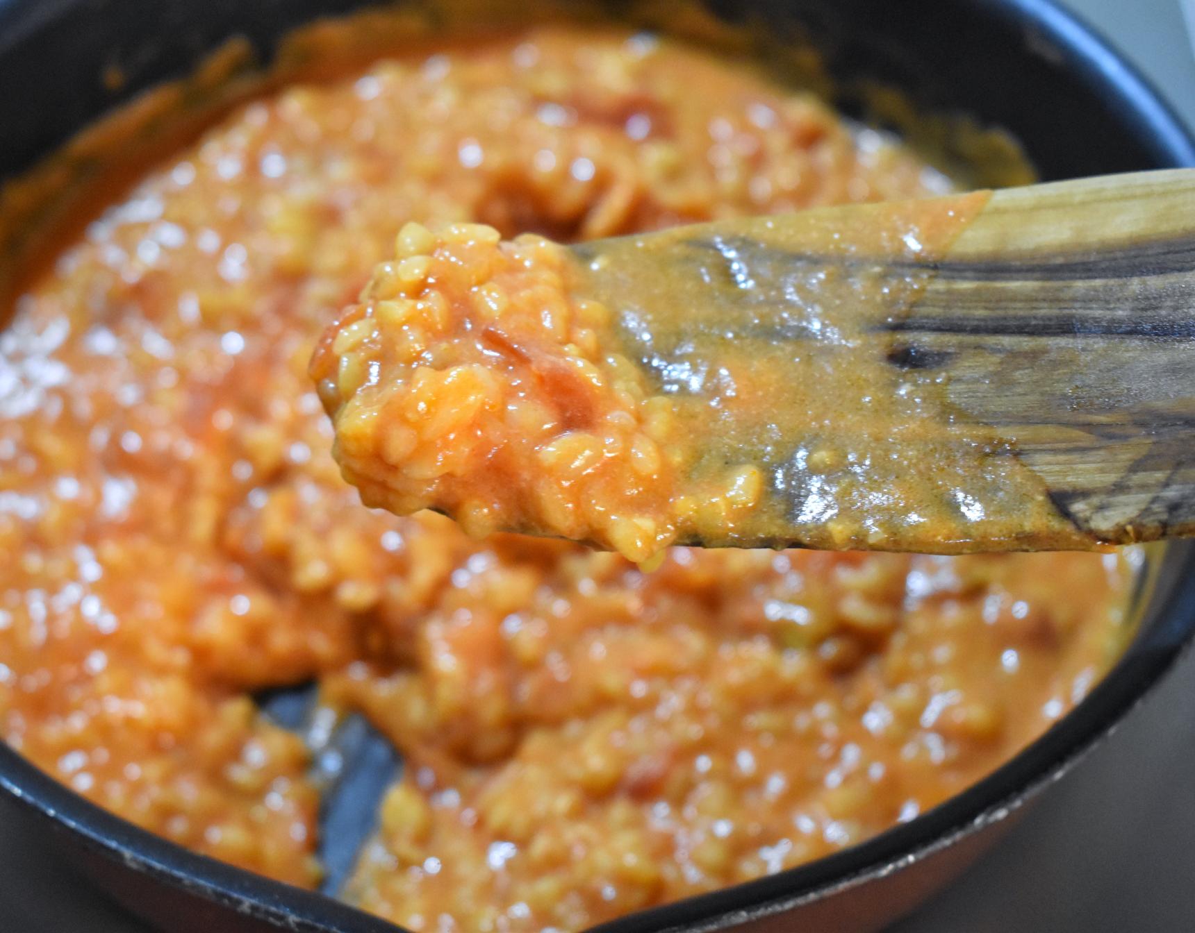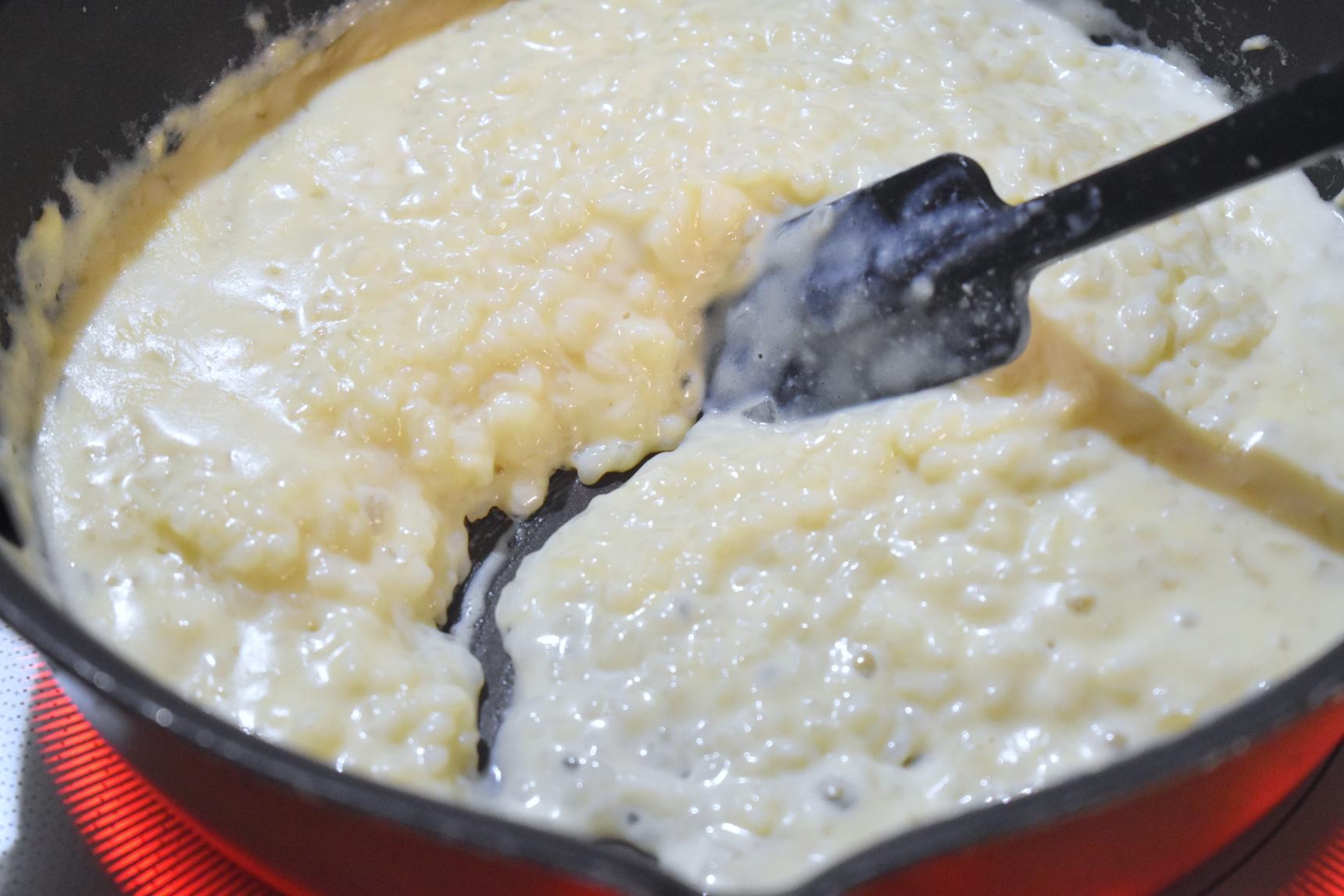 米の硬さを確認します。中心にほんの少し芯が残る程度が、アルデンテの目安です。まだ硬すぎるようであれば無調整豆乳(分量外)を少しずつ加えて、好みの硬さになるまで煮詰めます。