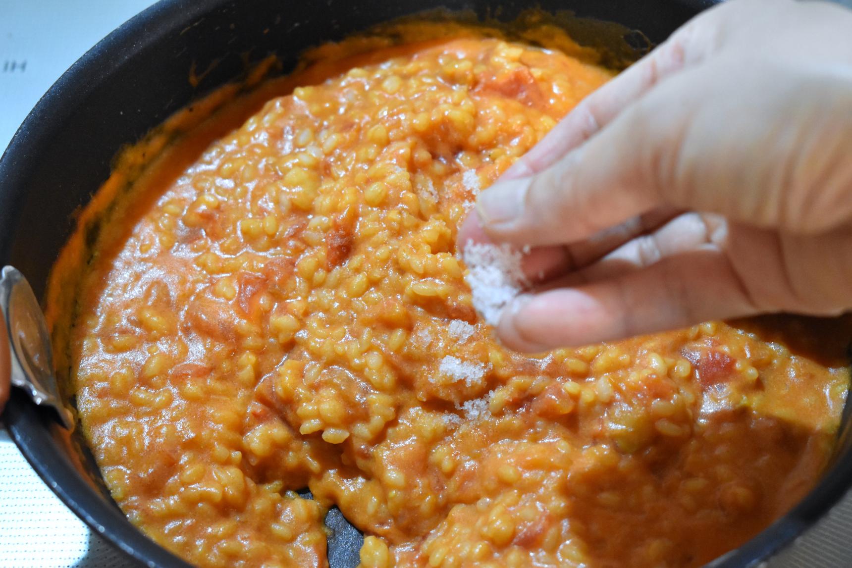 好みの硬さになったら味見をして、塩とこしょうで調味します。材料にある塩の分量は、あくまで目安です。好みの味に仕上げましょう。