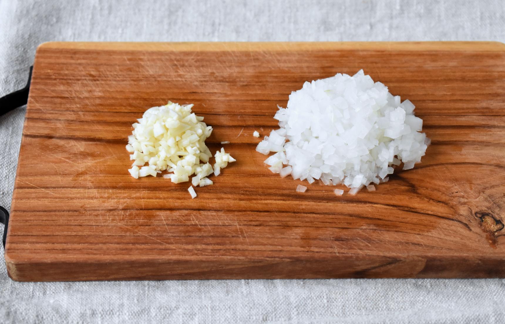 ・玉ねぎとにんにくをみじん切りにします。なるべく細かく切っておくと、なめらかな口あたりに仕上がります。