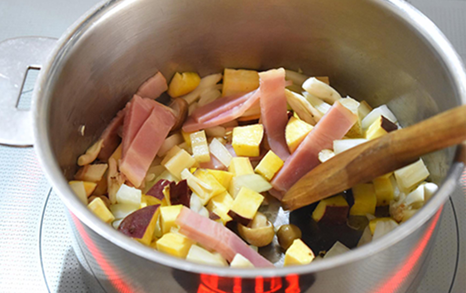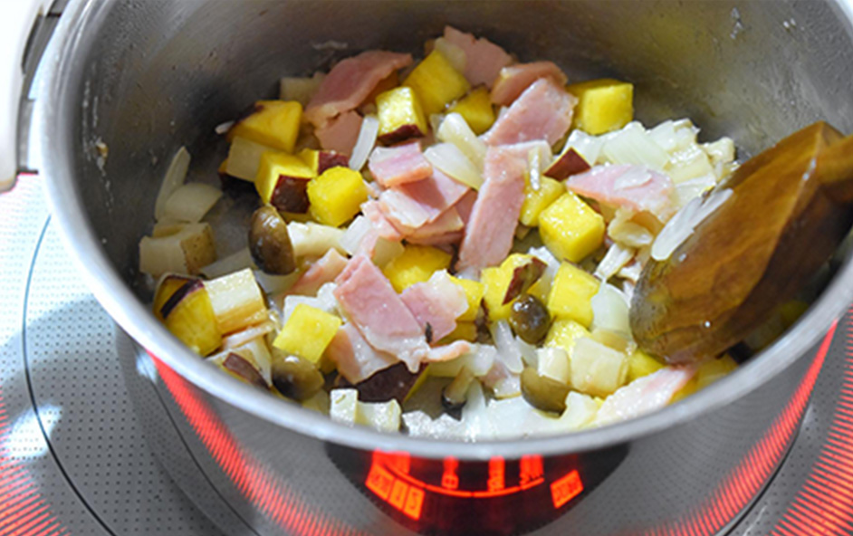 鍋にバターを入れて熱し、中火でスライスベーコン、玉ねぎ、さつまいも、れんこん、しめじを炒めます。