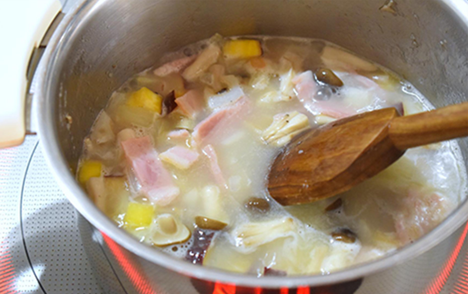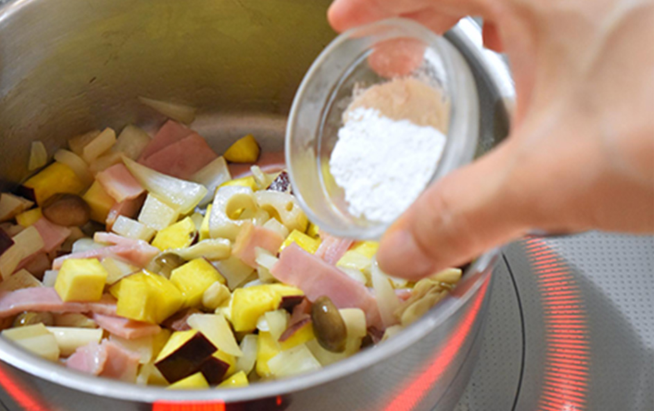 調理時間を短縮するため、具材は小さめにカットします。少量のバターと小麦粉でしっかり炒め合わせれば、自然なとろみがつき、やさしい仕上がりになります。