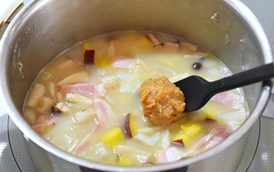 いったん火を止め、みそを溶き入れます。