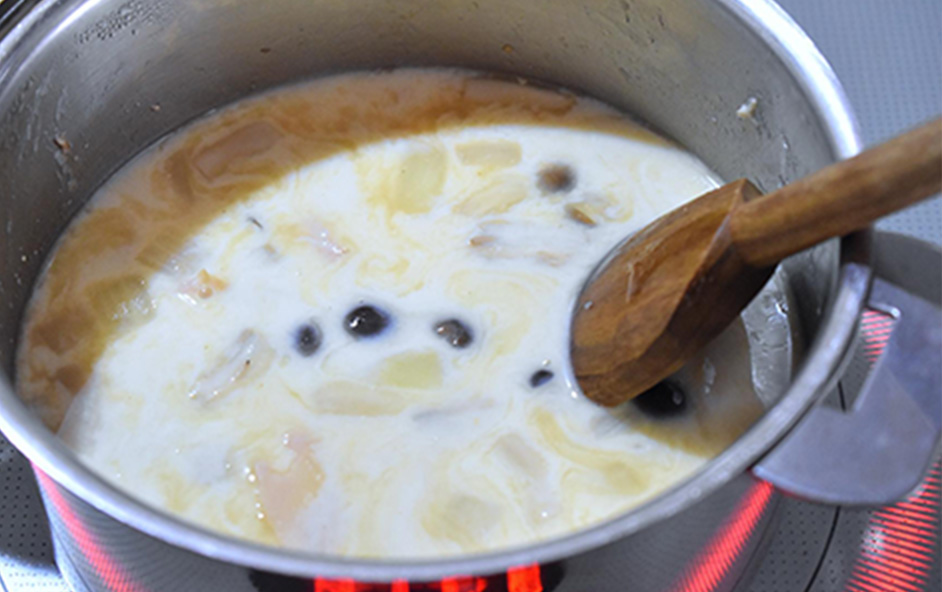 豆乳を加える前に具材に火を通し、調味料を全部煮溶かしておくと、豆乳を加えてからはさっと温める程度ですみます。小麦粉は粉っぽさがなくなるまでよく炒めておくと、とろみをつけやすくなりますよ。