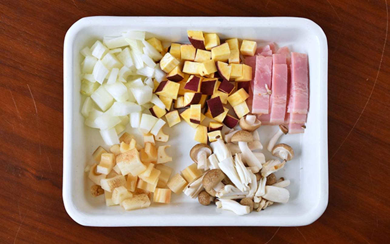 スライスベーコンを1cm幅に切ります。玉ねぎ、さつまいも(皮つき)、れんこん(皮つき)は1cm角にカットします。しめじは1本ずつほぐして2cmくらいの長さに切ります。