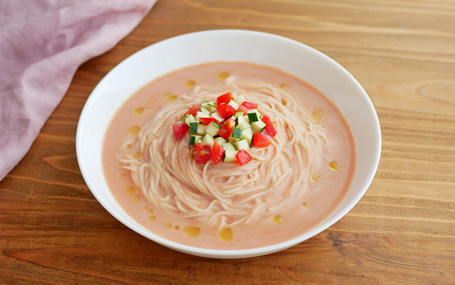 豆乳とトマトジュースで、栄養バランス&おいしさがアップ。トマトもグルタミン酸が多いので、おいしく仕上がります。野菜を飾れば、見映えも華やか。栄養が偏りがちなそうめんのアレンジとして、おすすめですよ。