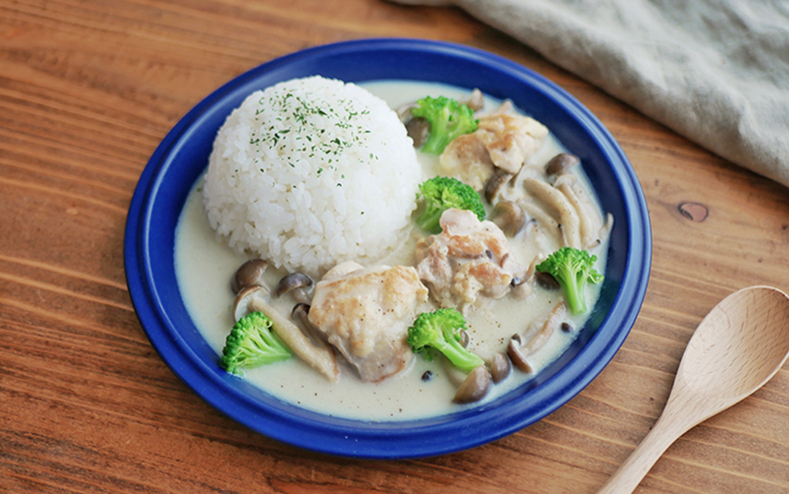 きのこ×豆乳の組み合わせで作る、クリームライス。きのこのグアニル酸と大豆由来のグルタミン酸を掛け合わせ、うま味が倍増します。豆乳を使うことで、生クリームよりもあっさりとヘルシーにいただけます。
