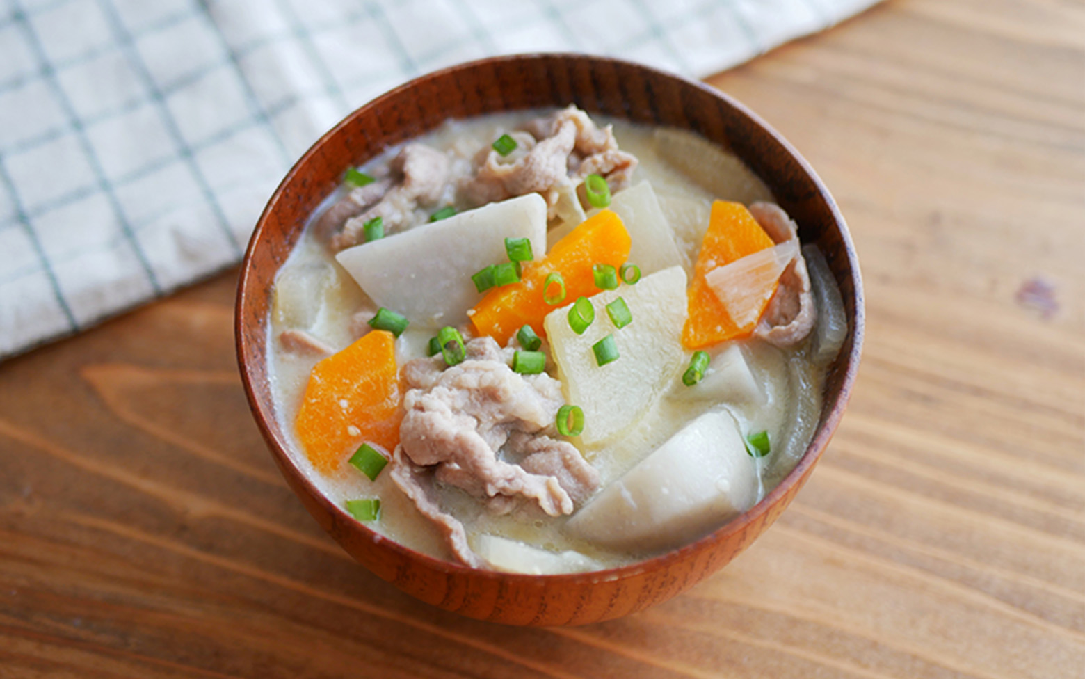 豆乳入りで栄養満点の豚汁です。野菜もたっぷり摂れます。切るのが面倒な人や、野菜を使い切れないひとり暮らしの方は、冷凍豚汁ミックスを使ってもOKです。かつおだしと大豆製品のうま味が相乗効果を生みます。