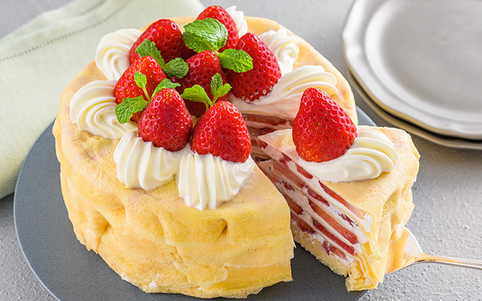 ミルクレープは「千枚のクレープ」という意味のフランス語を指す、日本発祥のケーキです。豆乳のクレープ生地の間に、苺と生クリームをたっぷり入れて積み重ね、かわいらしく仕上げました。